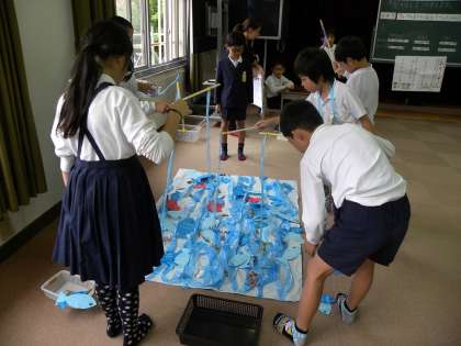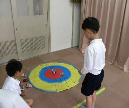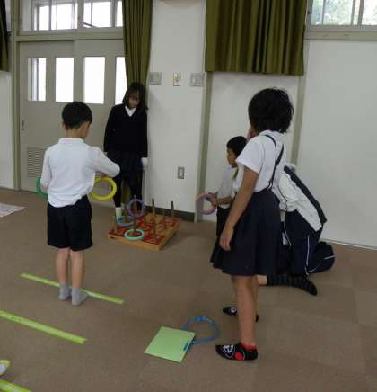 「さかなつり」「わなげ」「ボールなげ」「記憶力ゲーム」の4つのお店がありました。お店屋さんとお客さんに分かれて活動します。