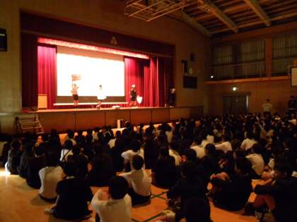 「風邪から体を守るんジャー」をテーマに風邪予防について保健委員さんが劇をしたり、手洗いの効果についての実験をみせたりしました。