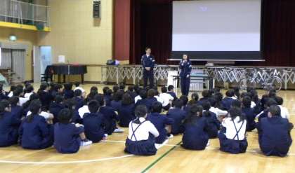 交通安全教室でした。4、5、6年生は鶴見警察署の交通安全課のおまわりさんにきていただき自転車の安全な乗り方についてのDVDを見て担任の先生と学習をしました。