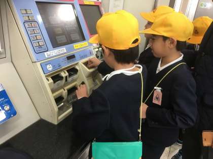 2年生は乗り物体験学習をしました。徳庵駅で一人ずつ切符を買い、電車に乗って放出駅に行きました。放出駅では駅員さんの仕事やお客さんの安全、事故をおこさない工夫をしていることについてのお話を聞きました。
