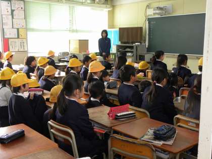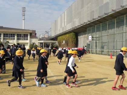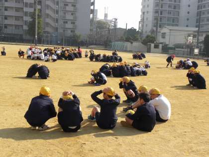 自分で緊急放送を聞き、判断し行動しなくてはいけません。運動場で遊んでいた人たちや廊下、階段にいた人たちは揺れがおさまるまで身の回りで安全な場所を選んで頭を守りながら座って待ちます。「運動場へ避難しましょう」の放送でそれぞれの場所から、運動場へ避難してきました。