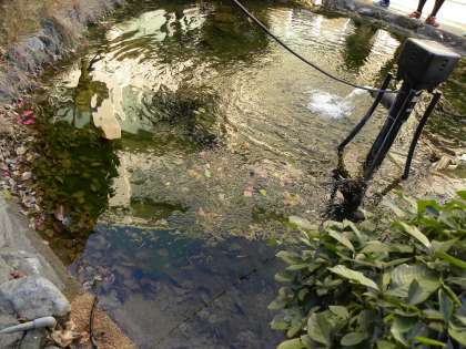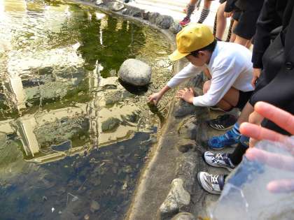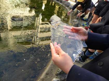 池に行くと氷が張っていました。冷たいのに氷のかけらを集めています。「花びらも葉っぱも一緒に凍ってるよ」
