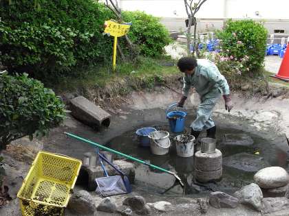 5月9日(水)、池の清掃をしました。たくさんの泥や木の葉などがたまって汚れていましたが、水を抜き、泥などをすべて取り除きました。(写真上)