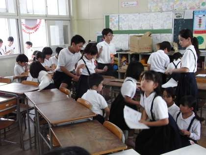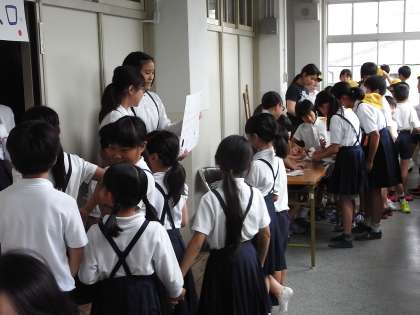 (写真中)「世界一周の旅」:地図をもとに世界の国のスタンプを集めよう!