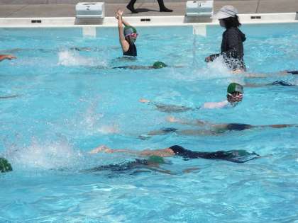 2年生は3時限目に入りました。水温は28度。いい感じですね。けのびやバタ足など、頑張って練習しました。