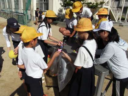9月3日(月)の児童集会では、宝さがしをしました。この日の宝は、折り紙で作った手裏剣です。赤組と白組に分かれて、運動場に隠された宝を探しました。