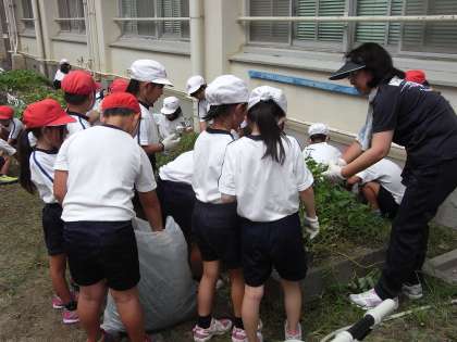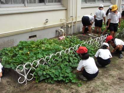 2年の学習園には、今、さつまいもが植わっており、緑色の葉が青々と茂っています。しっかりと根を張って、もっともっと葉が生い茂るように、9月6日(木)、2年生は学習園の草引きをしました。
