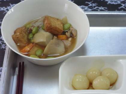 そこで、今日(9月19日)の給食は、「月見の行事献立」ということで、「鶏肉とさといもの煮物」と「みたらしだんご」がでました。「みたらしだんご」は、砂糖や濃い口しょうゆ、でんぷんなどで作ったたれが、白玉だんごとしっかりからまって、とってもおいしかったです。