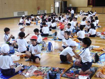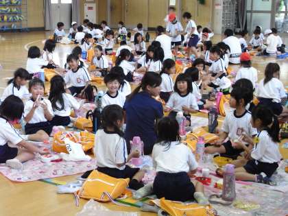 昼食は、各家庭から用意してきたお弁当を、学年全員そろって体育館で食べました。おうちの方の愛情のこもったお弁当を、とてもおいしそうに楽しみながら食べていました。