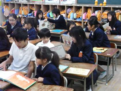 また、1年生は、6年生のペアクラスのお兄さん、お姉さんの読み聞かせを聞きました。1年生は、絵本を見ながら、6年生のおはなしにじっと耳を傾けていました。時には、微笑む表情も見られ、とても和やかで温かい雰囲気でした。