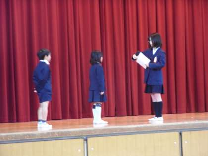 続いて、11月12日(月)〜16日(金)の「手洗い・うがい強調週間」での取り組みで、クラス全体としてよく頑張った3クラスに、健康委員会より表彰状が贈られました。