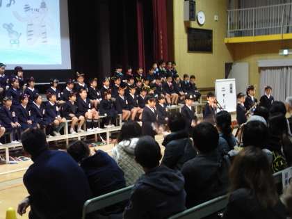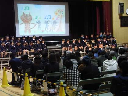2年は、劇「ニャーゴ」をしました。無邪気な子ねずみたちとねことの何ともユーモラスなやりとりを表現しました。合奏やリズムあそびを盛りこんで紙しばい風に演じました。