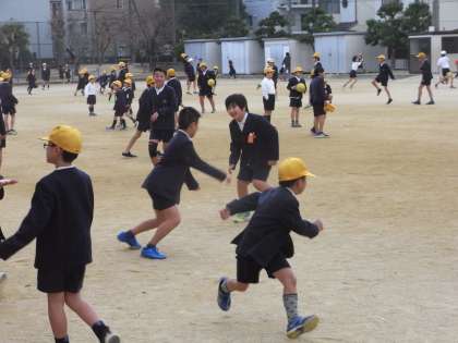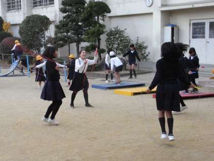 今日(1月9日)は、とても風の冷たい一日でした。昼休みの気温は9度。時折、雪も舞うほどでした。でも、子どもたちは元気いっぱい。運動場では、たくさんの子どもたちが、ドッジボールやなわとびなどをして遊んでいました。