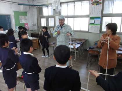 4年生は、ロープの結び方や使い方を学びました。ロープは、大きな力にも耐える強度を持ち、災害時・緊急時は命を救う道具として必需品です。倒壊家屋の柱や家具を動かして救助、火災では高所からロープ伝いの脱出、洪水では濁流からロープ伝いの脱出などに使われます。