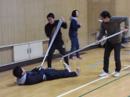 さすまたは、先がU字型になっており、両手でつかまれた場合には簡単に相手に奪われ、逆に凶器として使われてしまう恐れがあり危険です。使用する場合には、一人で立ち向かわず、なるべく大勢で立ち向かい、相手を捕まえるということより、児童を避難させることを最優先に行うことが大切であることを学びました。