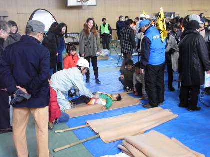 講堂では、ロープ結束・新聞紙スリッパ・毛布と棒を使っての担架などの体験コーナーや、簡易トイレの展示などがありました。