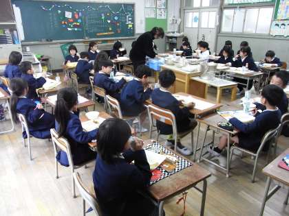 3月19日(火)、今年度最後の給食となりました。献立は、鶏肉のてり焼き、さつまいものみそ汁、きんぴらごぼう、ごはん、牛乳でした。みそ汁は、さつまいもがたっぷり入っていて、甘みをしっかりと感じることができました。