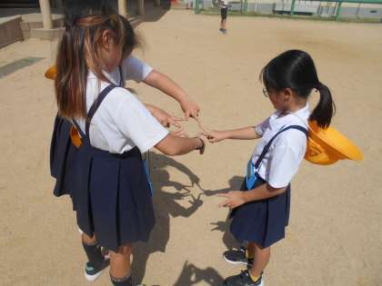 3人の子どもたちが協力して影を使って何やら表現していました。