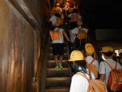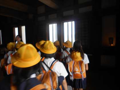 姫路城をバックに学年全員で記念撮影をした後(卒業アルバム用)みんなで天守閣に登りました。昔の建築様式がたくさん残っていて、馴染みの深い大阪城との違いにみんな驚いた様子でした!