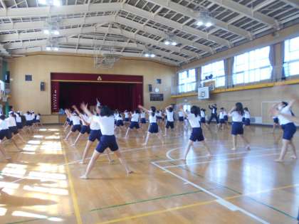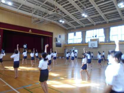 6年生の団体演技の練習です。みんなで「南中ソーラン」の振り付けの確認です。しっかりと体を動かすには朝の早い時間が最適ですね♪