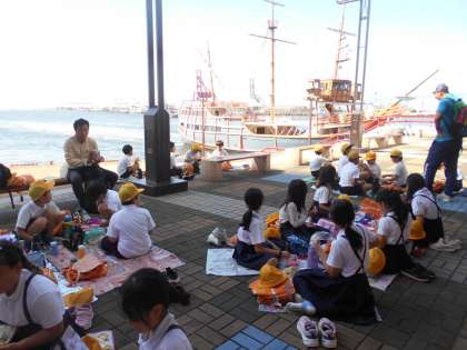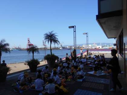 海遊館の横のスペースで素晴らしい青空と海を眺めながら、お楽しみのお弁当タイムです(^^)/