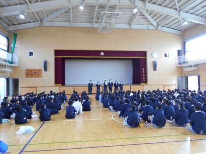 見学の前には近隣小学校の6年生児童と一緒に校則などの説明を聞き、小学校との違いを知りました。