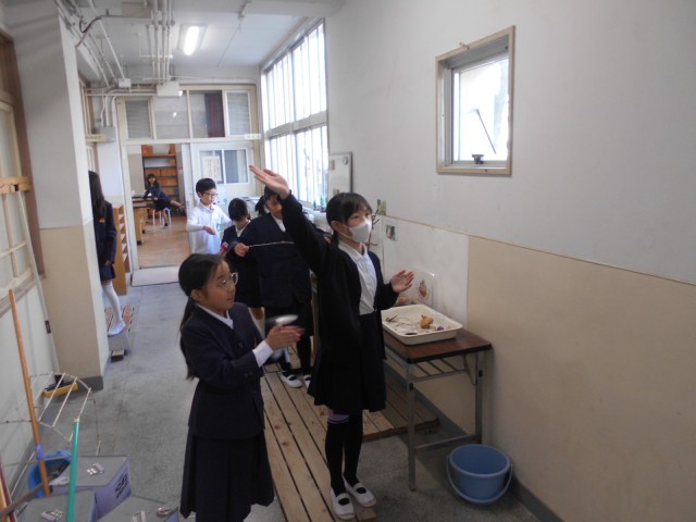 理科室の前に昔遊びの道具が置かれています。