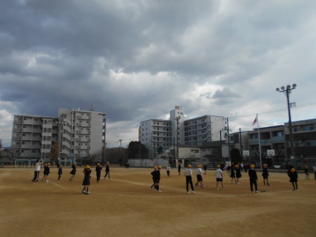 空は陽射しをさえぎる厚い雲で覆われ、強い風が広い運動場に吹き渡ります。