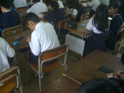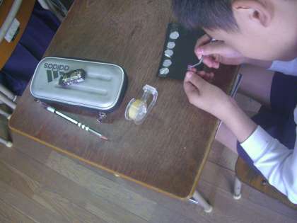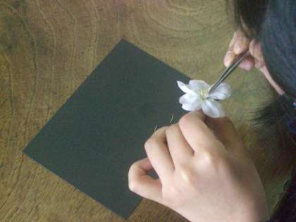 黒い画用紙の上に、ピンセットで花びら、おしべ、めしべ、がくを丁寧に分解して置き、テープで固定していました。