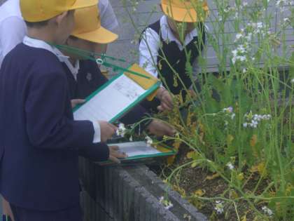 アブラナ科の植物の観察です。キャベツ、ハクサイ、カブラ、ダイコン、コマツナの花を観察して、スケッチし、気がついたことをまとめています。