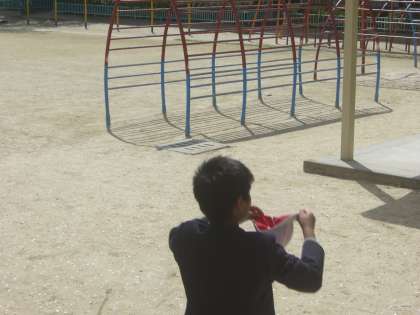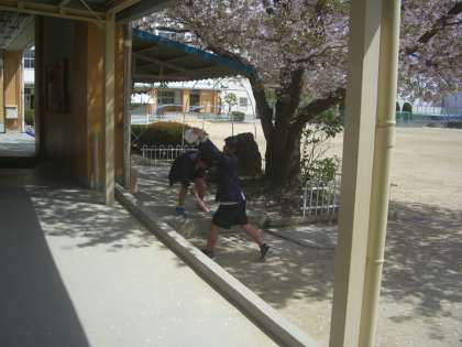サクラの楽しみ方もいろいろあるようで、運動場に座ってゆっくりながめてスケッチする女の子、風に舞う花びらを帽子ですくい取ろうと必死になっている男の子。