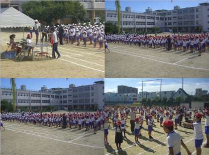 全校児童が集まり、入場行進と開会式の練習をしました。