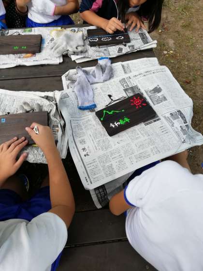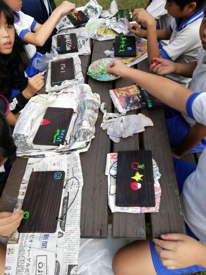 ハードな登山、ワイルドなカレーづくりの後は、地味な絵付け。