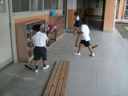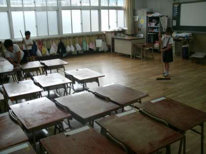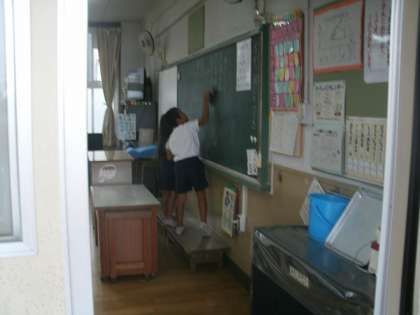 長いホウキに苦戦し、重いすのこを移動させ、背の届かない黒板の上まで必死に手を伸ばし、一生懸命に掃除する1年生。