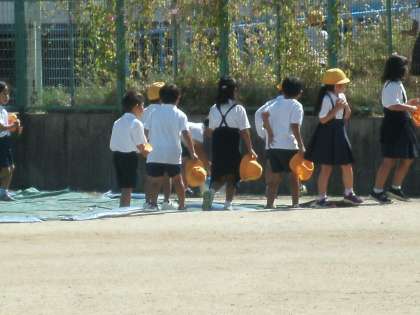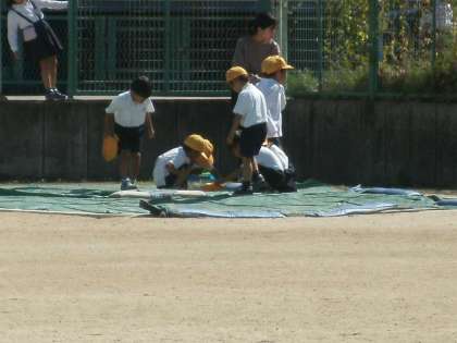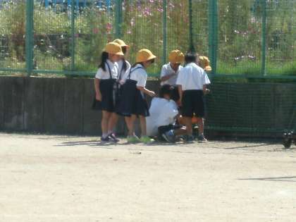 どうも、大きなバッタをみんなで追いまわしているようです。