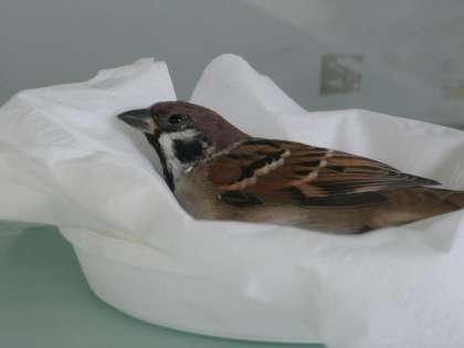 職員室の窓ガラスにぶち当たって、脳震とうを起こしたスズメです。