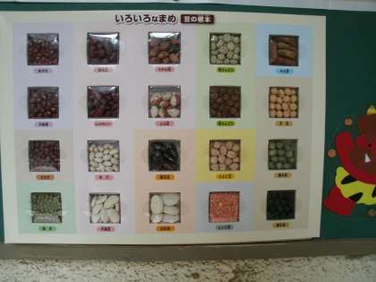 給食室前にいろいろな豆の標本があり、豆の種類の多さがわかります。