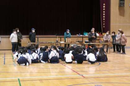 昔の道具や昔の遊びを体験した1年生と3年生。