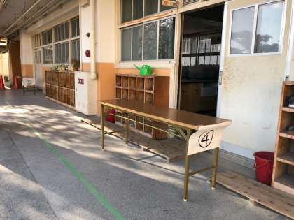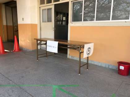 5の机にお進みください。担当より教科書等の袋詰めを受取りください。