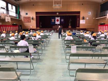 5年生は、講堂と多目的室の広い会場に分かれて登校日の活動をしました。