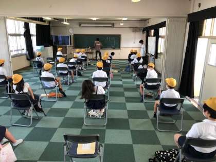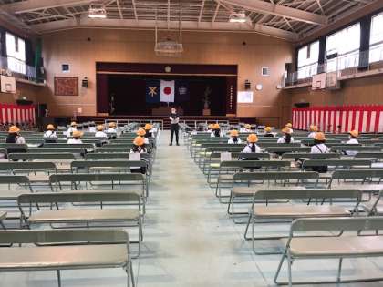 クラスごとに大きな会場で、登校の活動をしました。家庭からの提出書類や学習課題の回収、配付をしました。