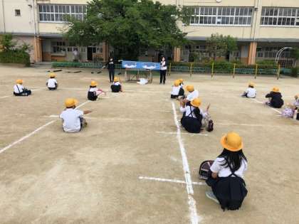 2年生の子どもたちは、先生の話を一生懸命に聞いて、ソーシャルディスタンスの間隔をイメージしていました。
