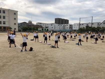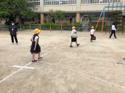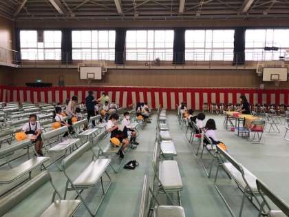 2年生は、ラジオ体操で体をほぐしてから1組は、体育館、2組は、多目的室に分かれて登校日の活動をしました。各会場への移動もソーシャルディスタンスをきちんと守っています。