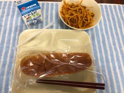 本日の給食献立は、次の通りです。 ◇スパゲッティミートソース ◇おさつパン ◇牛乳
