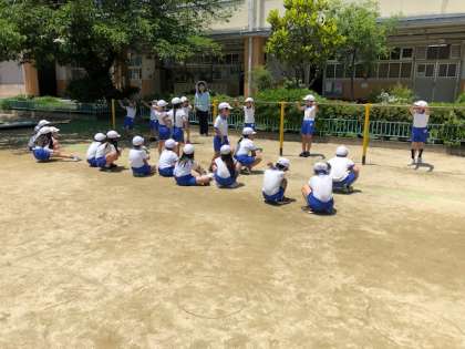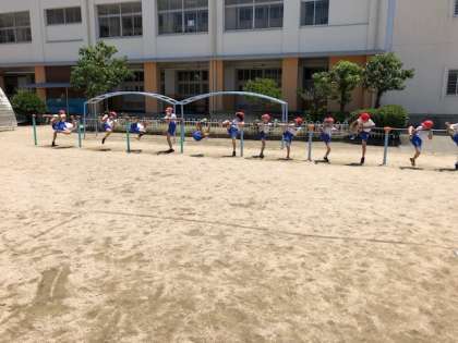 鉄棒にぶら下がって「ぶたのまるやき」、足をかけてぶら下がる「こうもり」、両手の間を足が抜ける「足抜き回り」など鉄棒を使ってたくさんの動きを楽しく試していました。いろんな動きを試して鉄棒で遊びを楽しんでほしいと思います。