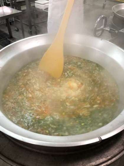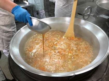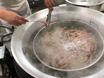 「ウインナーのケチャップソース」の食材で使用するウインナーの中心温度を確認しています。