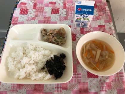本日の給食献立 ◇豚肉のごまみそ焼き ◇すまし汁 ◇のりのつくだ煮 ◇ごはん ◇牛乳