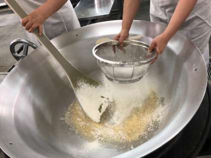 小麦粉をふるいにかけ、弱火で小麦粉が色づかないように慎重にルーを作ります。