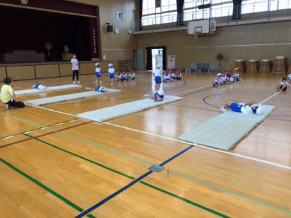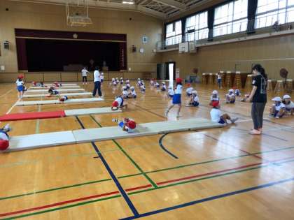 1年生が、体育の時間にマットを使った運動遊びを楽しみました。伏せた体勢で回転する運動は、体育館のような広い場所でしかできません。回転する運動は、目が回る感覚を味わうことで三半規管を鍛え、バランス感覚を養います。