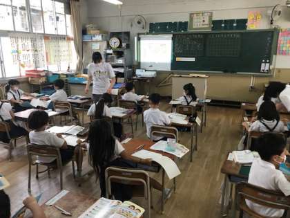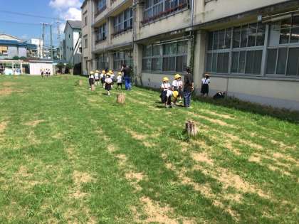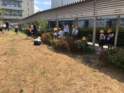 生活科では、「いきものとなかよくなろう」の学習で芝生広場に出てコオロギを採取しました。秋の「虫の声」が聴けるまで上手に飼ってほしいと思います。